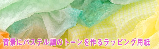 ラッピング用紙は、全体に敷いて使うには不向きですが、背景にぼかして使用すると淡いパステル調のトーンを作ることができます。2~3種類をシワシワにして重ねて透過光を使用するとファンタジックな世界ができあがります。