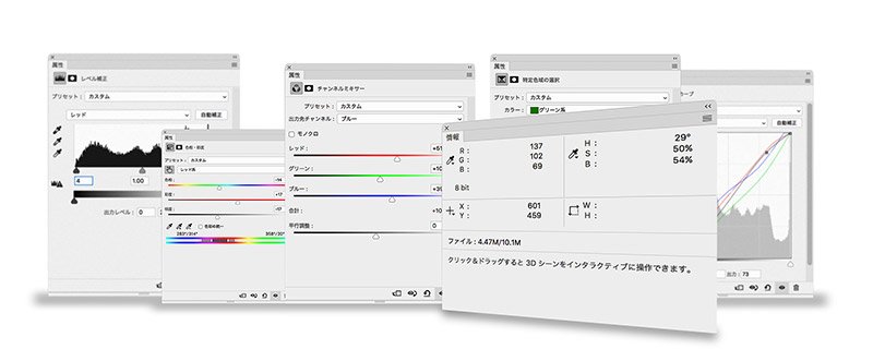 画像処理は、明るさやコントラスト、色彩などの色調整作業、傷や汚れ、映り込みの除去などの修復作業、その他に形状の変形加工、素材画像などとの合成作業等、多岐に渡ります。