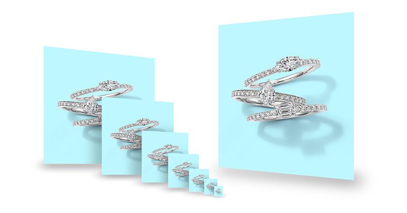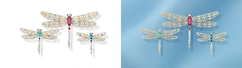 切り抜き加工は、画像処理の基本とも言える作業です。切り抜きで使用する写真はもちろん、写真を合成したい場合も必要になります。 また、角版の場合も切り抜いてから個別に補正を行った方が、綺麗な仕上がりとなります。 宝石の補正では、石と地金を全て切り抜いて個別に補正を行っています。こうした細やかなひと手間と作業がクオリティにつながります。
