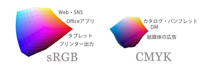 RGBデータを確認した時はキレイだったのに、印刷用のCMYKデータになったら色が沈んだり、くすんだりという現象はよく知られています。特に、鮮やかなネオンカラーやパステルカラー、果物のオレンジやエメラルドのジュエリーは、RGBで表現できても、印刷用のCMYKだと激しい色のくすみや階調喪失が起こります。これらの原因は、RGBの色域に比べて、CMYKの色域が狭いからです。色域外の色再現ができないのです。