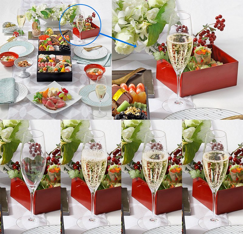 例を上げると、シャンパンや炭酸など泡の出る飲料の撮影です。 グラス一つであれば比較的問題ありませんが、複数のグラスがある場合、同時にタイミングよく注ぐことは不可能です。そうした場合、順番に注いでその都度一番良い状態で撮影を行い、後で画像を重ねて 1 枚に仕上げます。 さらにシャンパンの場合、そう単純ではありません。グラスに注ぐと勢いよく泡が立ち、液面で泡が飛沫となってグラスの内側に付着し、見た目が美しくありません。この飛沫の始末は、動かさないようにグラスの内側を拭いて綺麗にするか、最初の空のグラスデータを使用することになります。液面の良い状態も必要になります。作例では、たった一杯のシャンパンのために4枚の写真を合成処理しています。