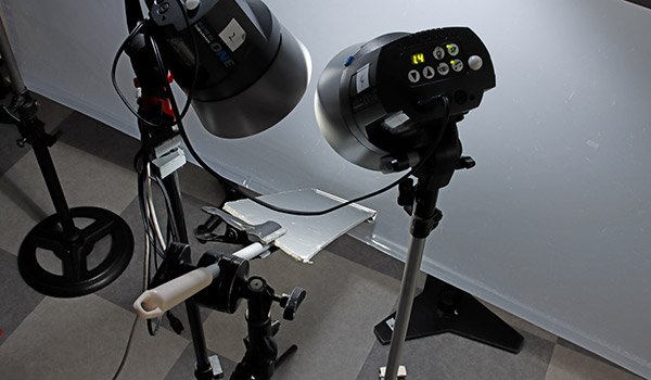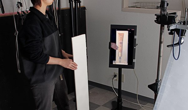 通常継ぎ目のないセットを一般的な撮影機材で組もうとすると2人以上の人員が必要で、セッティングに1時間程度かります。そして、その後の高さ及び角度調整も困難です。 そこで弊社では、1人でわずか数分でセットが組め、セッティング後の高さ·角度調整が極めて容易な継ぎ目のないライティングフレームを自作しました。フレームのサイズは、被写体の大きさに合わせて2サイズ。主に宝石や化粧品、半導体などの撮影で使用しています。