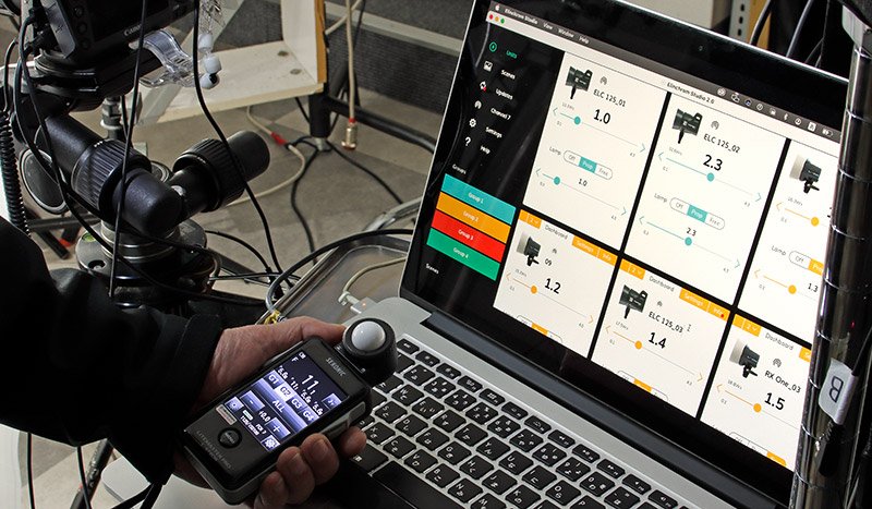 使用頻度の高いモノブロックタイプのストロボは、無線調光機能を搭載していますので、光量の調整から発光、セル、モデリングランプのON/OFFまで無線で対応できます。ライトの調整は、PCアプリ、タブレット、露出計、送信機などで行っています。 従来の大型ストロボは、個別に電源部に無線スレーブの受信機を内蔵させて、送信機を専用のワゴンで一括して発光を制御しています。