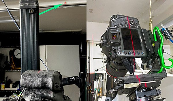このラインレーザーに合わせて、カメラ、天板、被写体を設置すると、正確に一直線に真っ直ぐ並びます。回転や傾きは鏡を使用することで、容易に合わせられます。