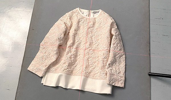 洋服の置き撮りには、フードにラインレーザーモジュールを搭載したズームレンズを使用。垂直·水平にクロスしたラインレーザーをガイドに、製品の配置位置を決定します。金物を加工してズームリングに取り付けることにより、バーを回すだけでズーミングができ、尚且つレンズの下りの防止にもなっています。