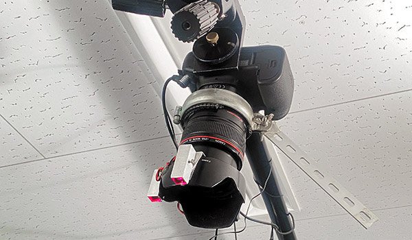 ボトル製品専用の雲台です。天体望遠鏡の赤道儀を改造して1秒間に0.5度の回転となっています。この雲台の利点は、手で触れることなく商品の正面を合わせられることです。雲台の上に商品を置く際には、回転中心軸にズレが生じないよう専用定規で合わせています。
