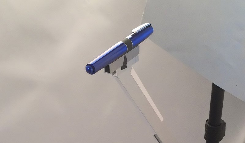 自立できない筆記具などの製品は、上下で傾きの誤差が出ない構造の自作固定具で空中に固定して撮影を行ないます。回転は手動で合わせる必要がありますが、大型モニターにオーバーレイで重ねて表示することで、繰り返し精度の高い撮影をスムーズに行うことができます。