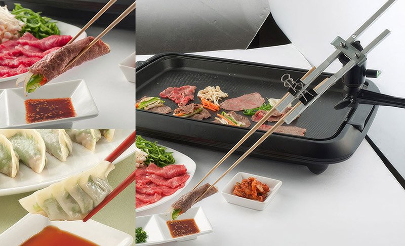 料理の撮影で、食品を箸で持ち上げて撮影する時に使用するのが箸マシーンです。人の手で支えるのが難しい加熱した鍋料理では必須です。小さな自由雲台で固定していますので、細かな角度や向きの調整も可能です。 一見簡単な構造に見えますが、この箸マシーンが優れているのはお豆腐や磯辺揚げなど柔らかい食品でも潰すことなく支えること。そして、繰り返し撮影を行う際に、設置位置にずれが生じないように、専用ダボで毎回同じ角度で固定できる点でも優れています。